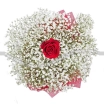 Уменьшенный: роза красная - 1 шт, гипсофила - 3 шт, фетр розовый. Примерный диаметр  букета 20х20 см.