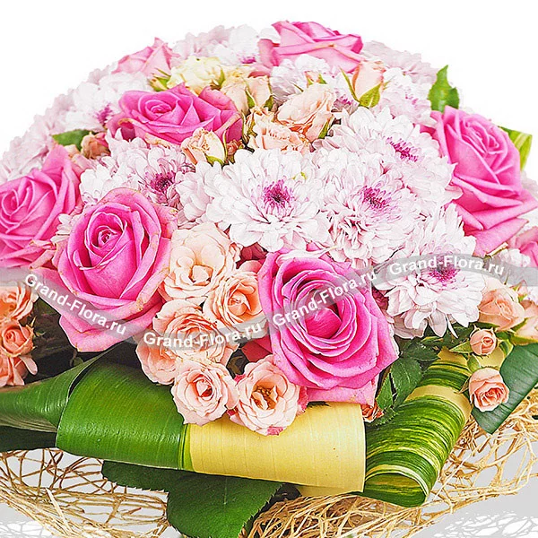 Стандартный (на фото): роза розовая - 7 шт, роза кустовая розовая - 6 шт, хризантема кустовая светло-фиолетовая - 4 шт, лист аспидистры загнутый - 4 шт, упаковка натуральная.