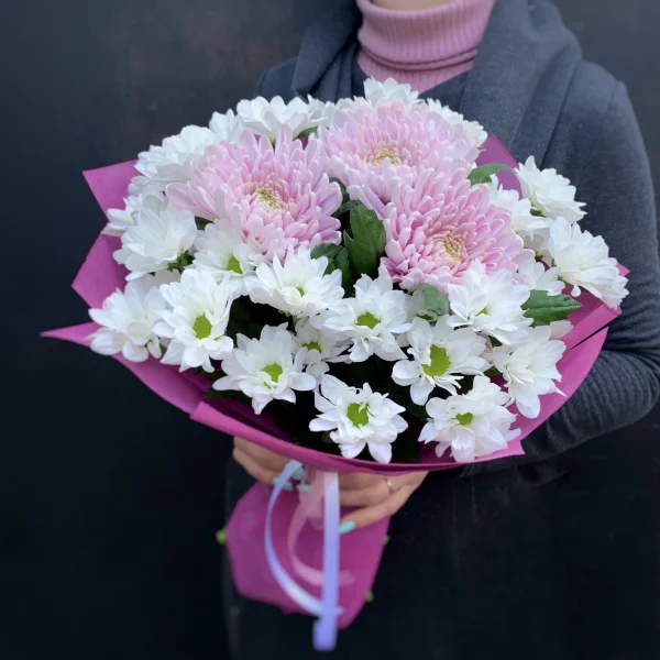Стандартный: хризантема кустовая белая - 4 шт., гербера розовая - 3 шт., фетр розовый, лента.