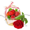 Стандартный: роза красная - 1 шт., рускус - 2 шт., персики - 1,5 кг, фетр розовый, корзина средняя, бант бело - красный.