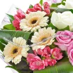Стандарный: роза белая - 2 шт., роза розовая - 3 шт., альстромерия розовая - 2 шт., гербера кремовая - 2 шт., кустовая роза розовая - 2 шт., лист аспидистра - 3 шт., упаковка розовая, лента розовая. Примерный размер: 25Х25 см.
