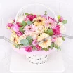 Стандартный: роза белая - 4 шт., гербера розовая - 1 шт., гербера желтая - 2 шт., тюльпан розовый - 3 шт., эустома розовая - 3 шт., эвкалипт, оазис, корзина. Примерный размер: 25Х30 см.