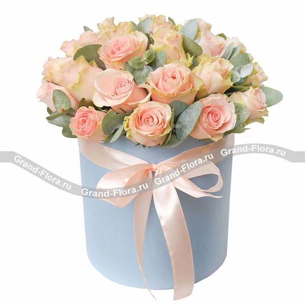 25 роз: роза розовая (Россия) 50 см.,- 25 шт., коробка круглая средняя (20*30) - 1 шт., эвкалипт, оазис.